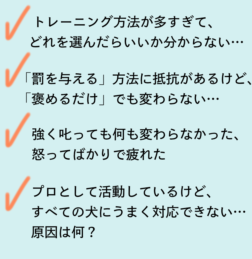 理論を深く学びながらも、それだけにとどまらず、「現場での実践経験」を何よりも重視。科学的知識と豊富なケース対応力を武器に、“罰を与えないトレーニング”の本質を伝え続けている。